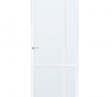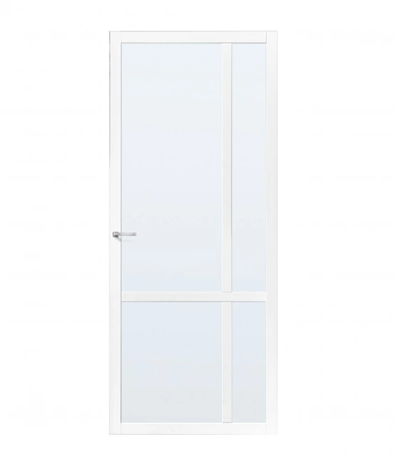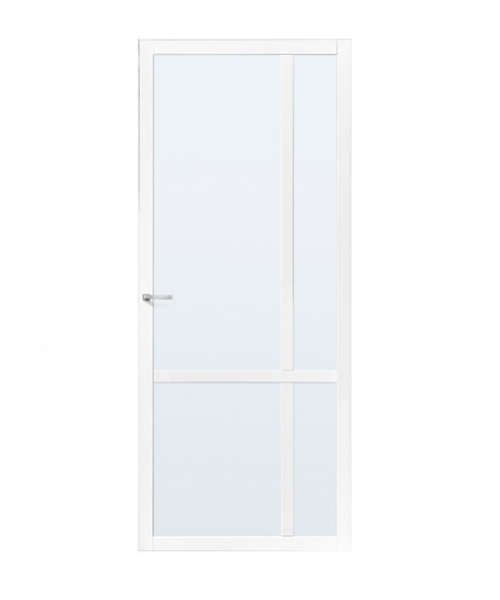 Deze minimalistische binnendeur heeft 4 glasopeningen. Deze deur is leverbaar met blank glas. nevel glas of rookglas. Deze deur kan als normale draaideur worden gebruikt, maar ook als schuifdeur door middel van een schuifdeursysteem of als taatsdeur door middel van taatsdeurscharnieren.