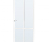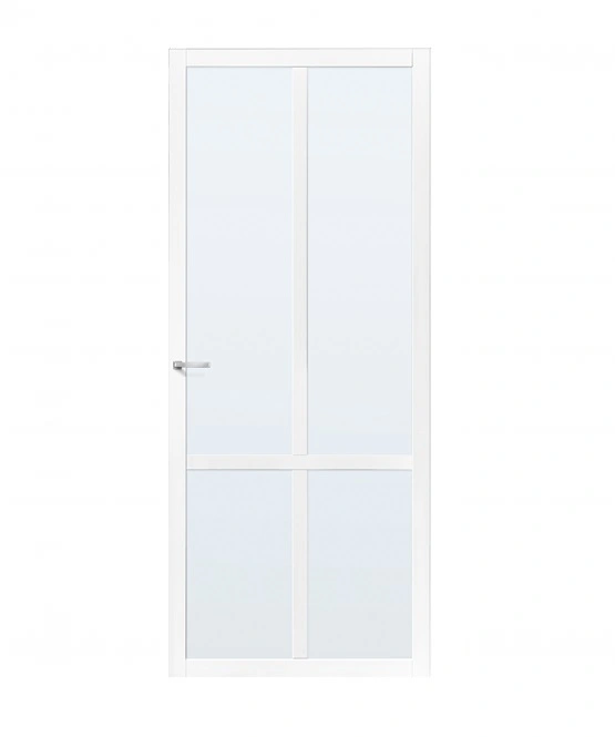 Deze minimalistische binnendeur heeft 4 glasopeningen met een kruisverdeling. Deze deur is leverbaar met blank glas. nevel glas of rookglas. Deze deur kan als normale draaideur worden gebruikt, maar ook als schuifdeur door middel van een schuifdeursysteem of als taatsdeur door middel van taatsdeurscharnieren.