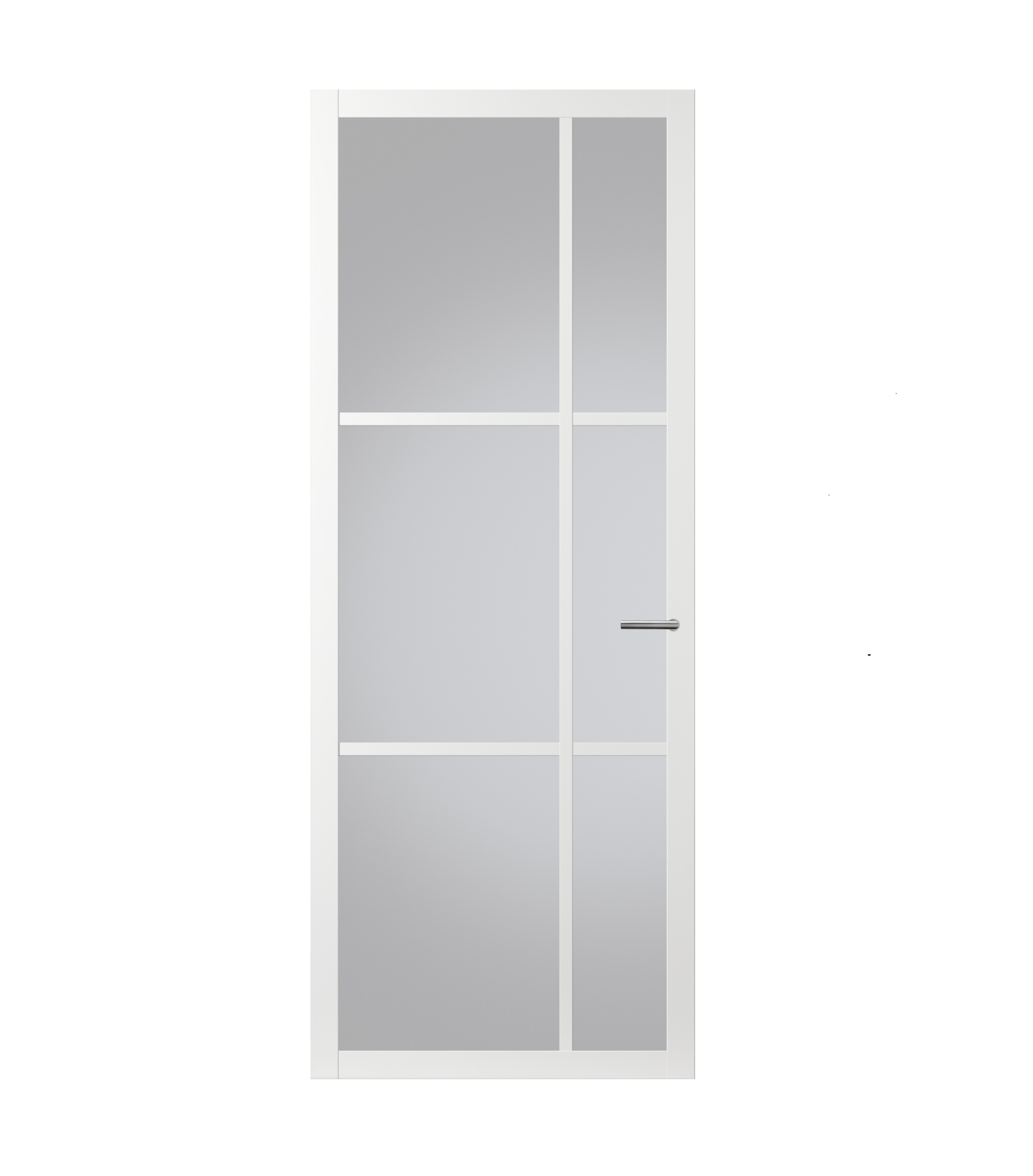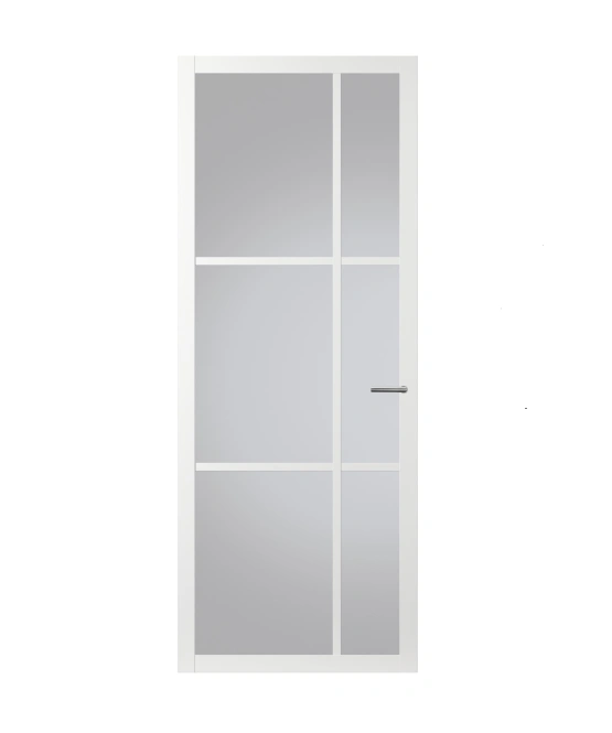 Deze afgelakte binnendeur is leverbaar met blank glas, satijn glas, rookglas of brons glas.